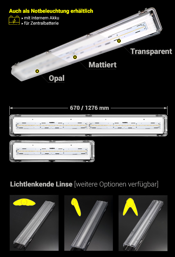 “OptiLine” bendrojo apšvietimo šviestuvai, kurie taip pat atlieka avarinio apšvietimo funkciją, yra dviejų ilgių (670 ir 1276 mm) ir šešių galingumų (20, 25, 30, 38, 48, 58 W). Kartu su 3 skirtingo permatomumo dangčio difuzoriais (išsami informacija toliau) gaunama net 18 skirtingų šviesos galios verčių – nuo 2900 iki daugiau kaip 10000 lm.