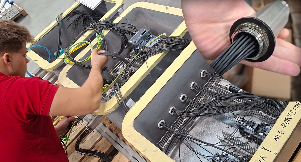 Kolejnym istotnym aspektem było precyzyjne zaprojektowanie połączeń kablowych między obudowami. W przypadku rozwiązań Ex d realizuje się je za pomocą specjalnych przepustów z wypełnieniem żywicznym, które wykonuje się specjalnie pod dany projekt. Oznacza to, że już na etapie koncepcji rozdzielnicy konieczne było dokładne określenie liczby połączeń oraz ilości i rodzaju kabli w każdym przepuście. Błąd na tym etapie bywa kosztowny i często prowadzi do opóźnień.
